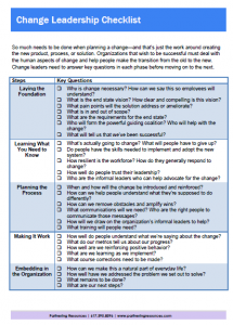 One clarification: It might sound as if this checklist is for people at the top who are imposing a change on the rest of the organization. Not so! It’s intended to be used by a cross-level, cross-functional steering committee that’s charged with planning and implementing the change within the organization.