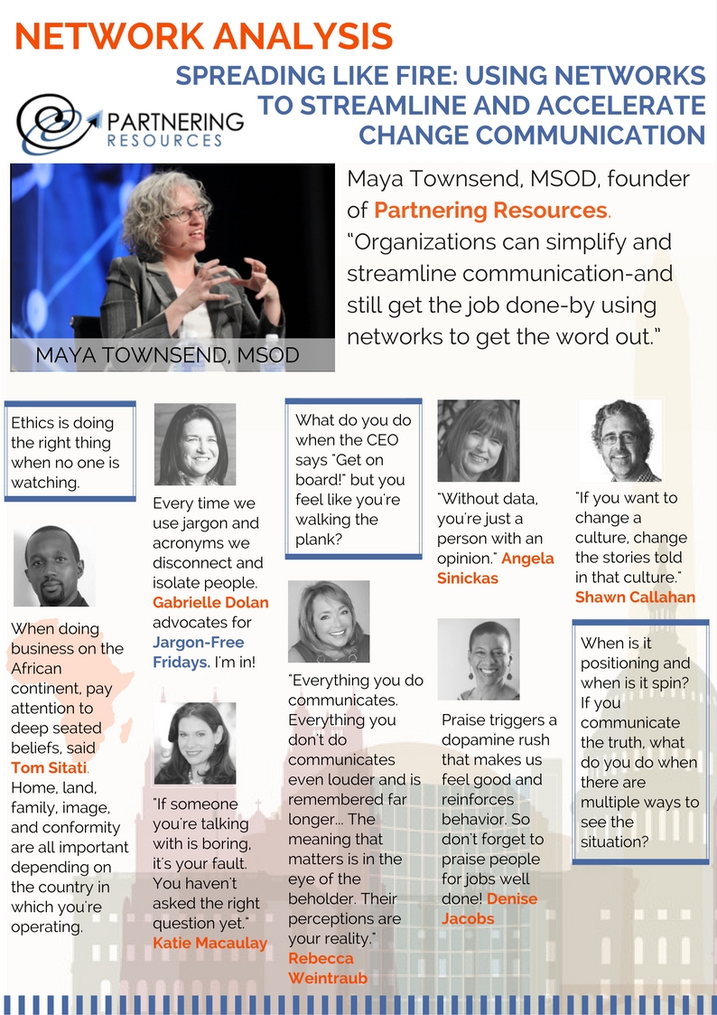 A great crowd attended my session on “Spreading Like Fire: Using Networks to Streamline and Accelerate Communication.” We talked about how 10 – 15% of people in any organization hold Critical Connector positions and have disproportionate influence over the whole. These Critical Connectors are the key to streamlining and accelerating communication. By engaging them early in the process, they can help disseminate messages and advocate for change.